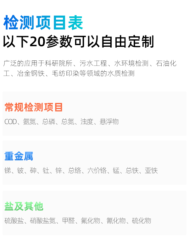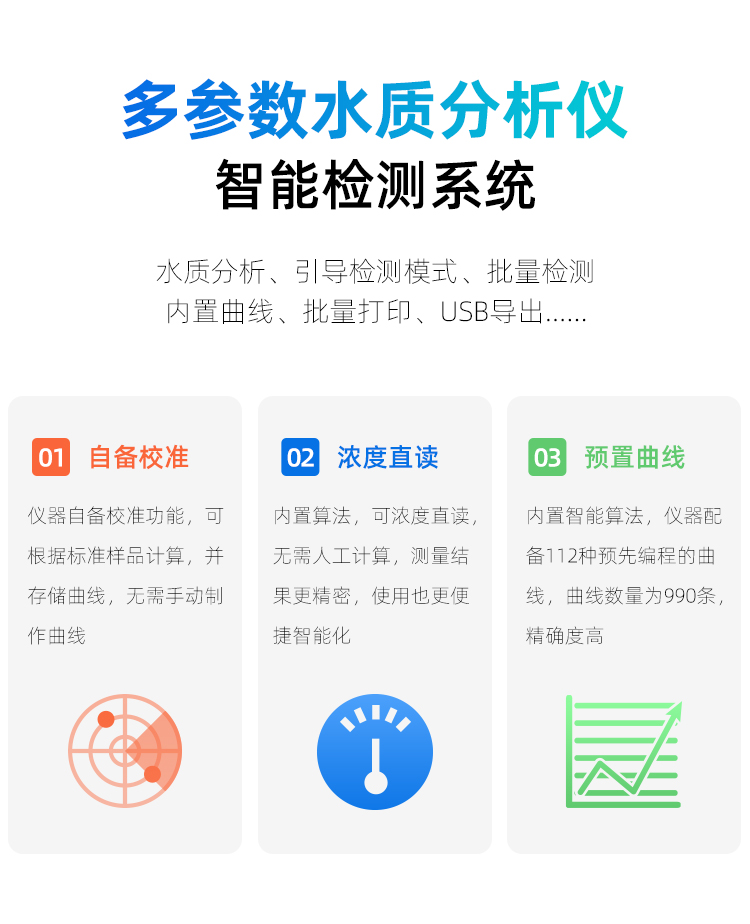 人工智能語音播報提示,可隨意調節音量, 使用更方便更 配備112種預先編程的曲線,曲線數量990條,可濃度直讀,測量結果更精密; 具有數據存儲功能,可存儲90萬組數據,并能自由查看; 10寸彩色液晶顯示觸摸屏,全中文操作模式,更便于操作掌握; 儀器自備校準功能,可根據標準樣品計算, 并存儲曲線,無需手動制作曲線; 配備USB接口傳輸功能,自帶打印機,可打印當前數據及存儲的歷史數據; 采用管比色、皿比色,雙比色系統